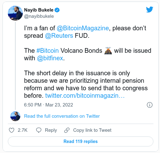 El presidente de El Salvador, Nayib Bukele, dijo el 24 de marzo que el gobierno retrasó la emisión de lo que podría ser el primer bono respaldado por Bitcoin del mundo para atender una reforma que debe enviarse primero al Congreso.
