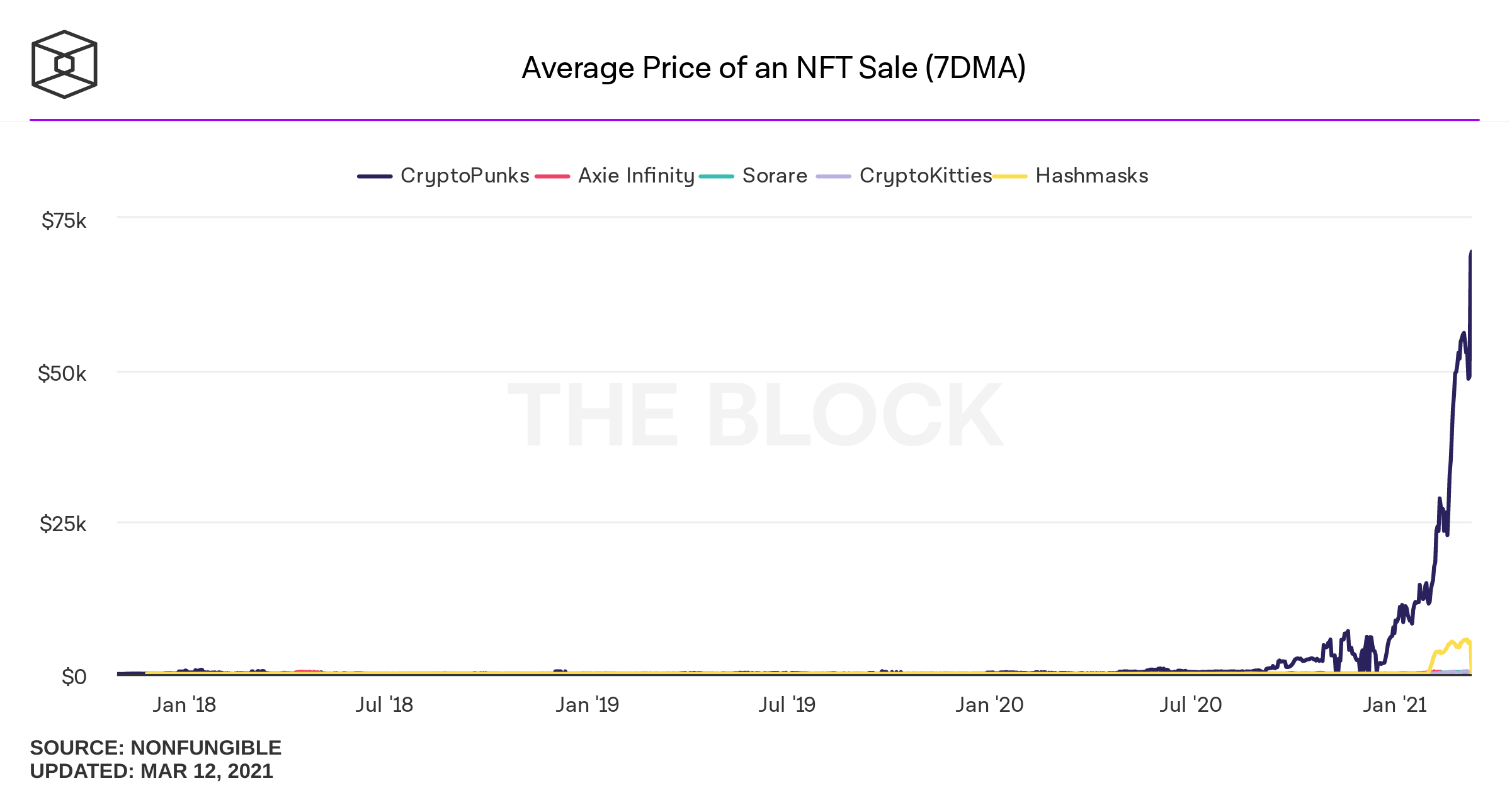 Por consultar otra referencia de este crecimiento, el pasado 11 de marzo se vendió un CryptoPunk, un NFT de avatar pixelado perteneciente a una colección limitada de 10.000 ejemplares, por $7,5 millones de dólares. Anteriormente, la venta más grande de un CryptoPunk había sido de $1,5 millones, de acuerdo a NonFungible.
