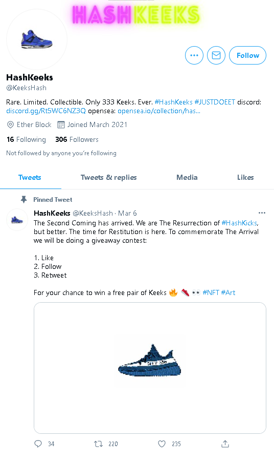 Como claros representantes de este movimiento, han aparecido diversas cuentas de Twitter creadas en pleno auge de los NFTs promocionando su propia colección. Como HashKeeks, una colección de zapatos con siluetas de marcas reconocidas bajo ilustraciones pixeladas que tienen un límite de 333 unidades.