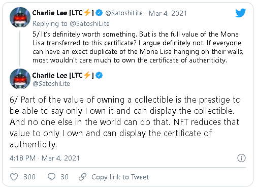 Con la analogía de la Mona Lisa, la característica de coleccionable se mantiene siempre y cuando se pueda diferenciar la original de la copia. Bajo este concepto, una posible característica similar en Ethereum podría ser la fecha de emisión de la blockchain de un NFT, para decidir cuál fue primero.