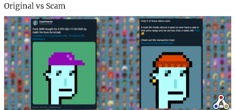 Siguiendo el mismo ejemplo de los CryptoPunks, cualquier persona puede idearse una serie limitada de elementos gráficos y emitirlos como NFTs en la blockchain de Ethereum bajo un concepto idéntico al de los CryptoPunks. Es decir que, estos sistemas de NFTs son replicables infinitamente, lo que podría dar paso a cazar inversores incautos que se desesperen por adquirir cualquier cosa que tenga el nombre de NFT.