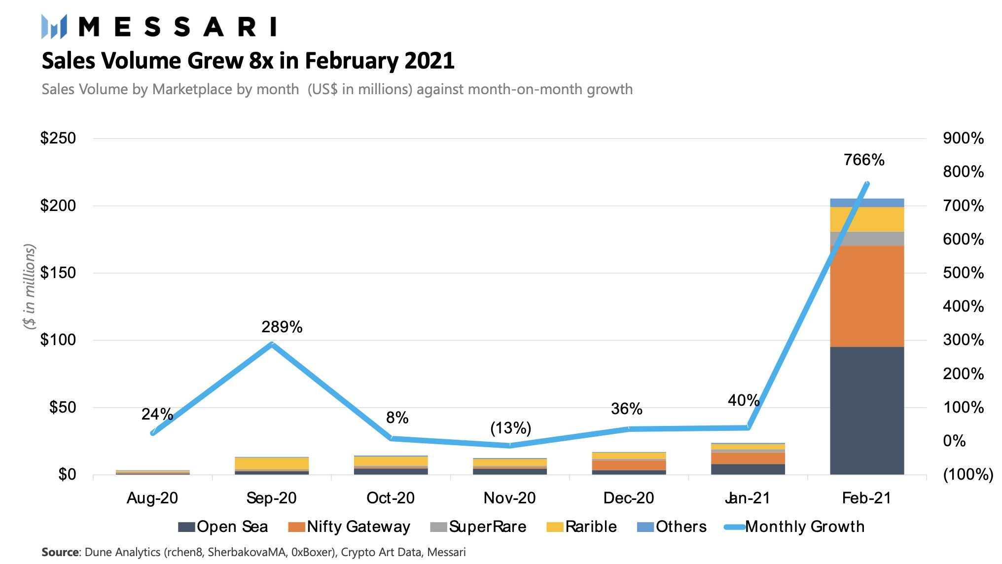 Según datos de Messari, el mercado de los NFT creció con una multiplicación por ocho en el pasado mes de febrero con respecto al mes de enero. Las cifras en volumen de intercambio superaron los $200 millones de dólares.