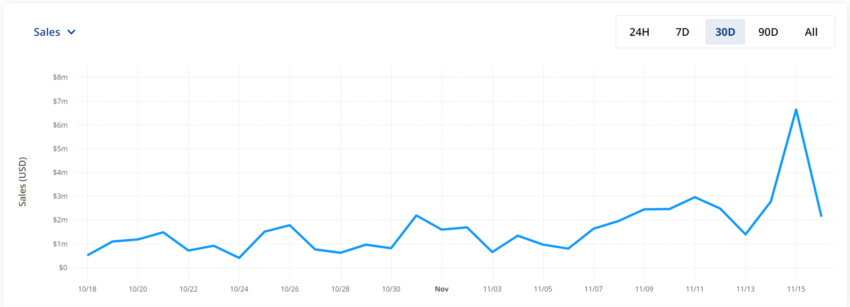 En los últimos 30 días, BAYC ha llegado a la cima con 49 millones de dólares en ventas, a pesar de un precio mínimo de 58,2 ETH.