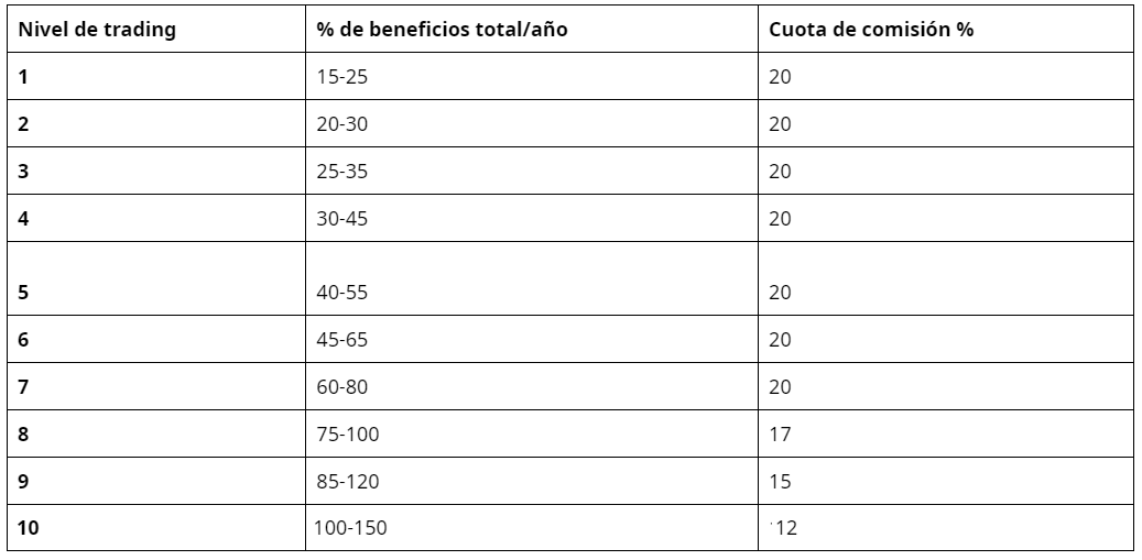 A continuación se muestra la tabla de comisiones para cada nivel de trading: