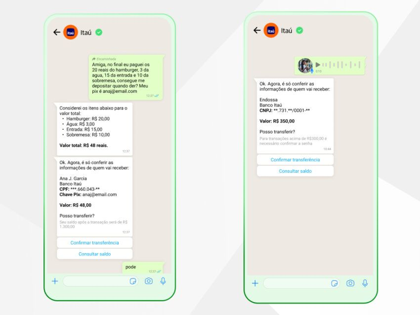 El banco Itaú presentó, este 22 de noviembre, su nueva solución tecnológica llamada “Inteligência Itaú”. Es una plataforma de inteligencia artificial que permite a los clientes realizar transacciones financieras directamente a través de WhatsApp, utilizando comandos de texto o de voz.
