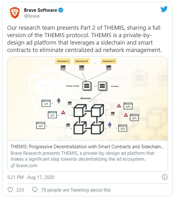 La iniciativa es una plataforma publicitaria llamada “THEMIS”. Themis es un protocolo descentralizado y de diseño privado que tiene como objetivo mejorar el ecosistema publicitario actual de Brave. Este nuevo protocolo viene con numerosas características potencialmente atractivas. Según Brave: