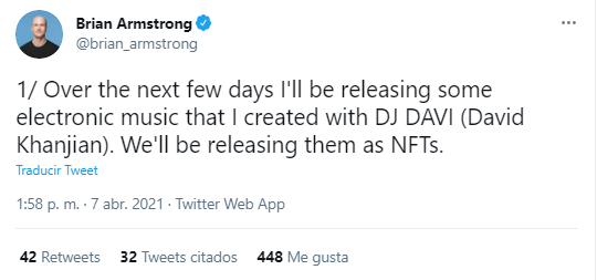 Durante al tarde del 7 de abril, Armstrong anunció a través de Twitter que se ha unido al hype de los tokens no fungibles (NFT):