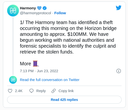 Harmony publicó que “identificó un robo” que ocurrió en el bridge Horizon. El exploit fue por una suma de aproximadamente 100 millones de dólares en varios criptoactivos que se enviaron a la dirección Ethereum del hacker.