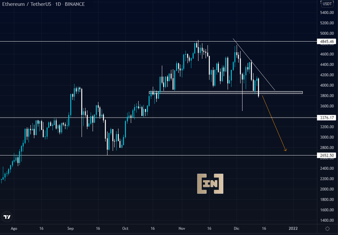 En las ultimas horas el precio de ETH ha registrado una nueva caída, perforando la línea de soporte de los 3,800 dólares.