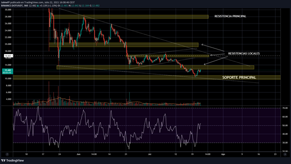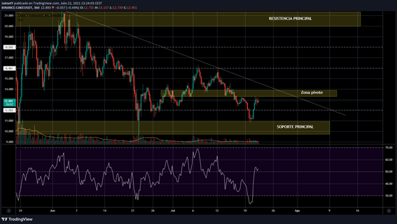 Pese a la sesión de ayer no debemos olvidar que ya perdió el anterior soporte importante en el entorno de los 13 dólares y los 13.5 dólares y que, en el momento del análisis no ha conseguido recuperar, por lo que pasa a ser su primera gran resistencia a tener en cuenta en potenciales subidas y a diferencia de otras altcoins no ha conseguido encadenar un nuevo máximo creciente.