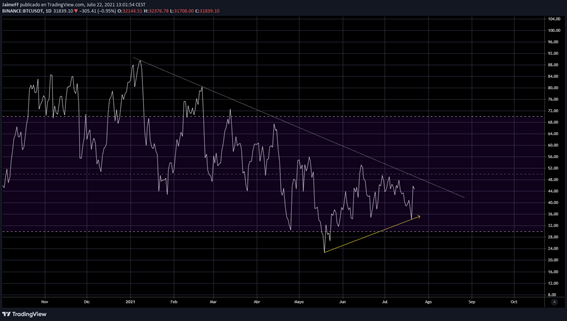 Por el lado de los indicadores cabe destacar que parece estar formando una divergencia alcista en la temporalidad diaria, ya que los mínimos en el precio son decrecientes y en el indicador son crecientes, esta divergencia se confirmaría si además rompiéramos la directriz bajista en el RSI que a día de hoy no hemos conseguido romper, como se aprecia claramente en la gráfica.