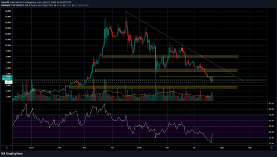 Análisis de la gráfica en velas diarias: La gráfica de THETA nos presenta una tendencia descendente bastante pronunciada desde los máximos históricos alcanzados a mediados de abril.