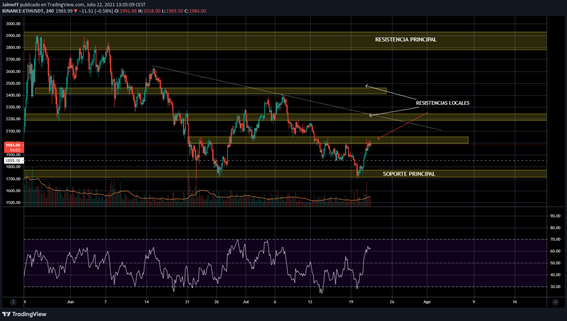 En el momento del análisis parece estar consolidando en cerca de la resistencia de los 2,000 dólares aunque no consigue romperla, al menos de momento.