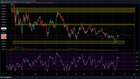 Análisis de la gráfica en velas de 4 horas: Después de salirse del canal que estaba respetando y alcanzar los 29,200 dólares aproximadamente, puso a prueba una vez más el gran soporte del rango en el que nos encontramos.