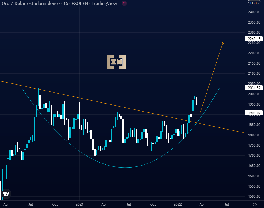 La formación de taza en el gráfico proyecta una continuidad alcista con proyección al área de los 2,270 dólares como un nuevo ATH.