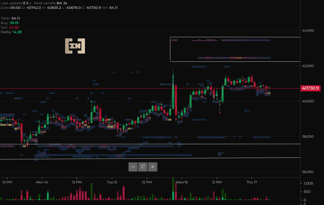 Por otra parte, se puede apreciar en el segundo gráfico los orden block ubicados en la gran zona de liquidez de los 42,000 dólares a los 44,000 dólares y otra gran zona de liquidez ubicada en los 36,000 dólares.