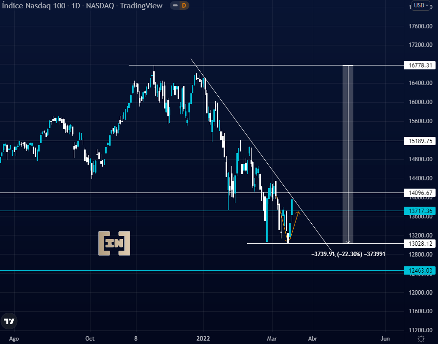 El índice NASDAQ-100 es uno de los mayores afectados en el ultimo descenso del primer trimestre del año. Una caída del 22.30% desde su ultimo ATH los 16778 puntos.