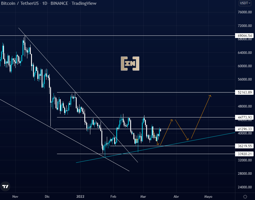 Todo parece indicar que la zona de los 42,000 dólares a los 44,000 dólares será de ventas mientras que la de los 36,000 dólares a los 34,000 dólares de recompra, con altas posibilidades de confirmarse una redistribución y no una acumulación del activo.