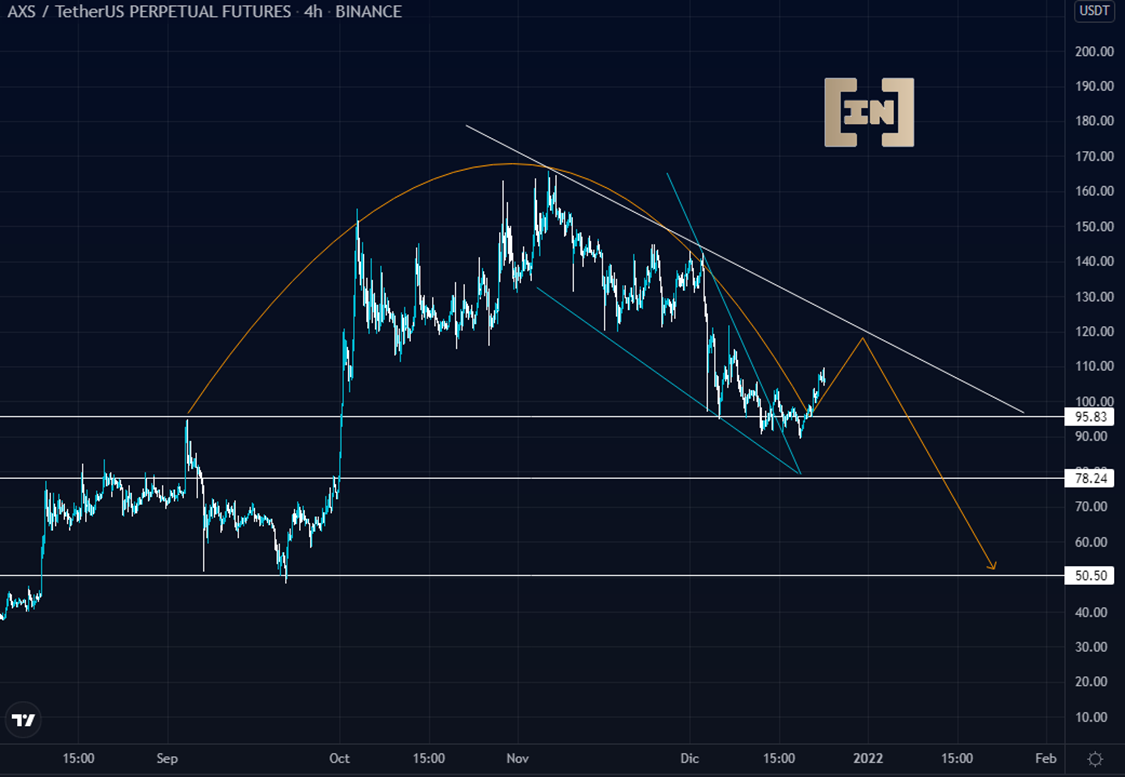 El precio de AXS se proyecta a los 120 dólares. En el gráfico se pueden apreciar tres patrones chartistas. El primero un “triángulo descendente”, el cual tuvo ruptura por encima de los 95 dólares.