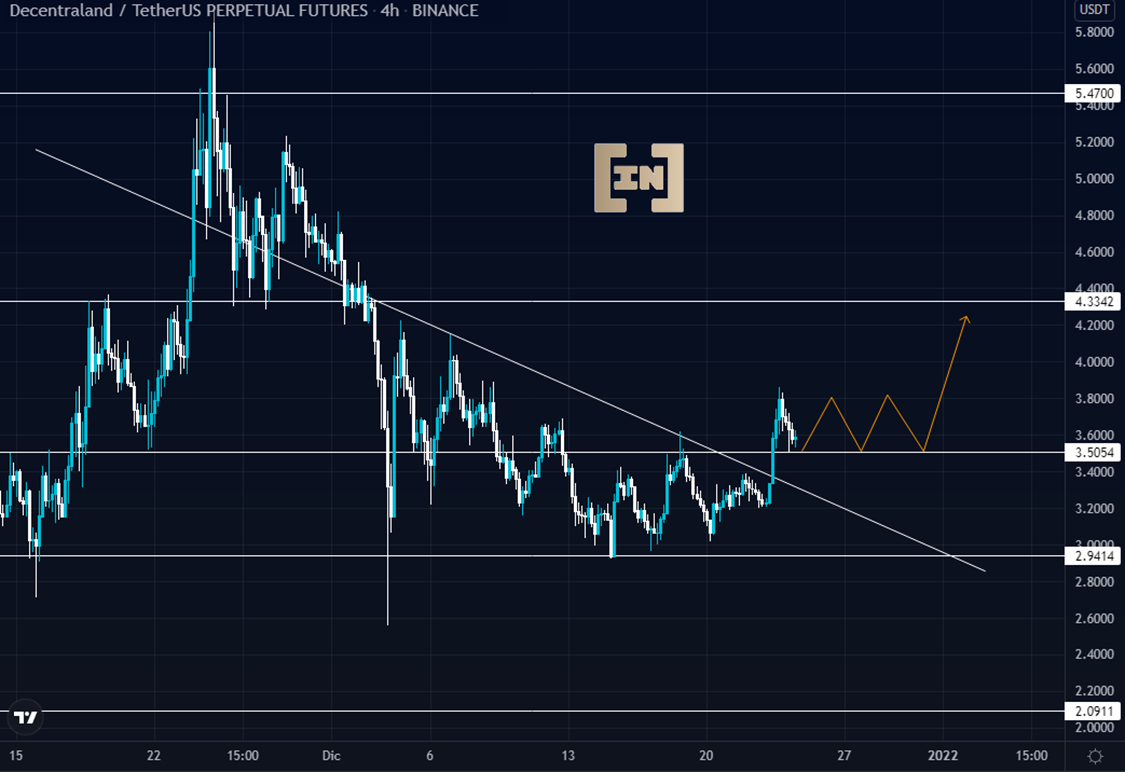 MANA ha creado un pullback en el soporte de los 3.5 dólares, confirmando la ruptura. Pasará a la siguiente fase de “acumulación” entre los 3.5 dólares y 3.8 dólares creando el impulso necesario a superar el siguiente objetivo: los 4.3 dólares.