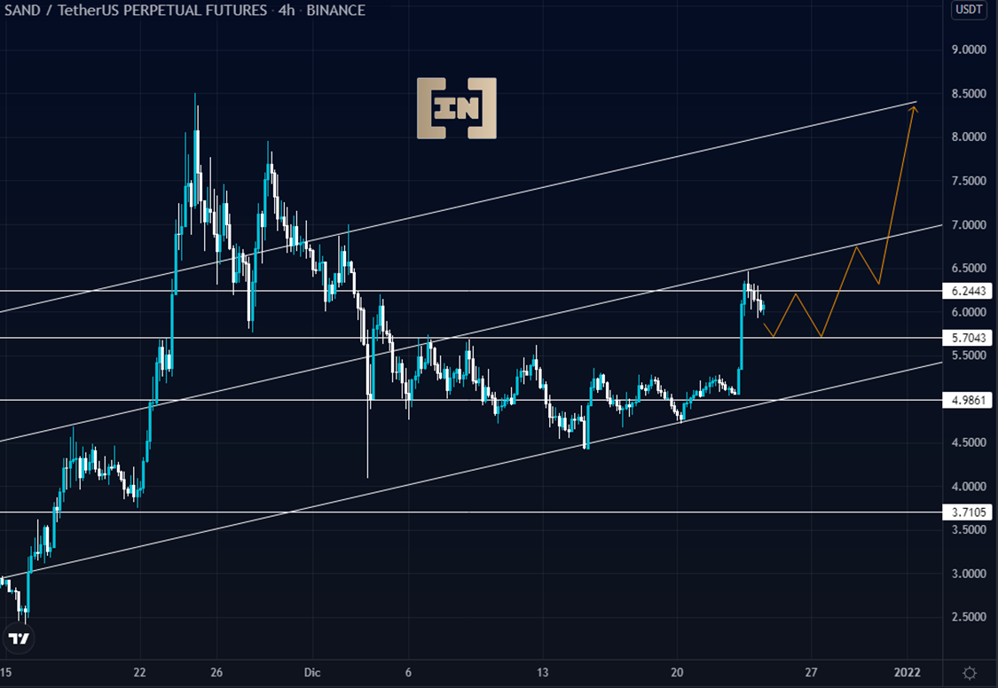 El precio de SAND ha usado el área de soporte de los 5 dólares como fase de acumulación. Podría presentar un ascenso controlado y pausado respetando tanto el fractal y los soportes con proyección ascendente a los 8.5 dólares.