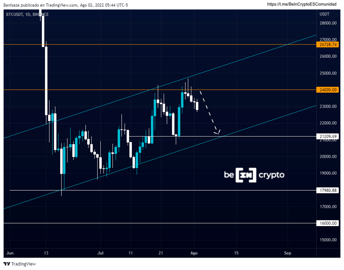 En tiempo diario, se puede detallar mejor como el precio de Bitcoin continúa descendiendo intentando buscar el nivel de los 21,300 dólares.