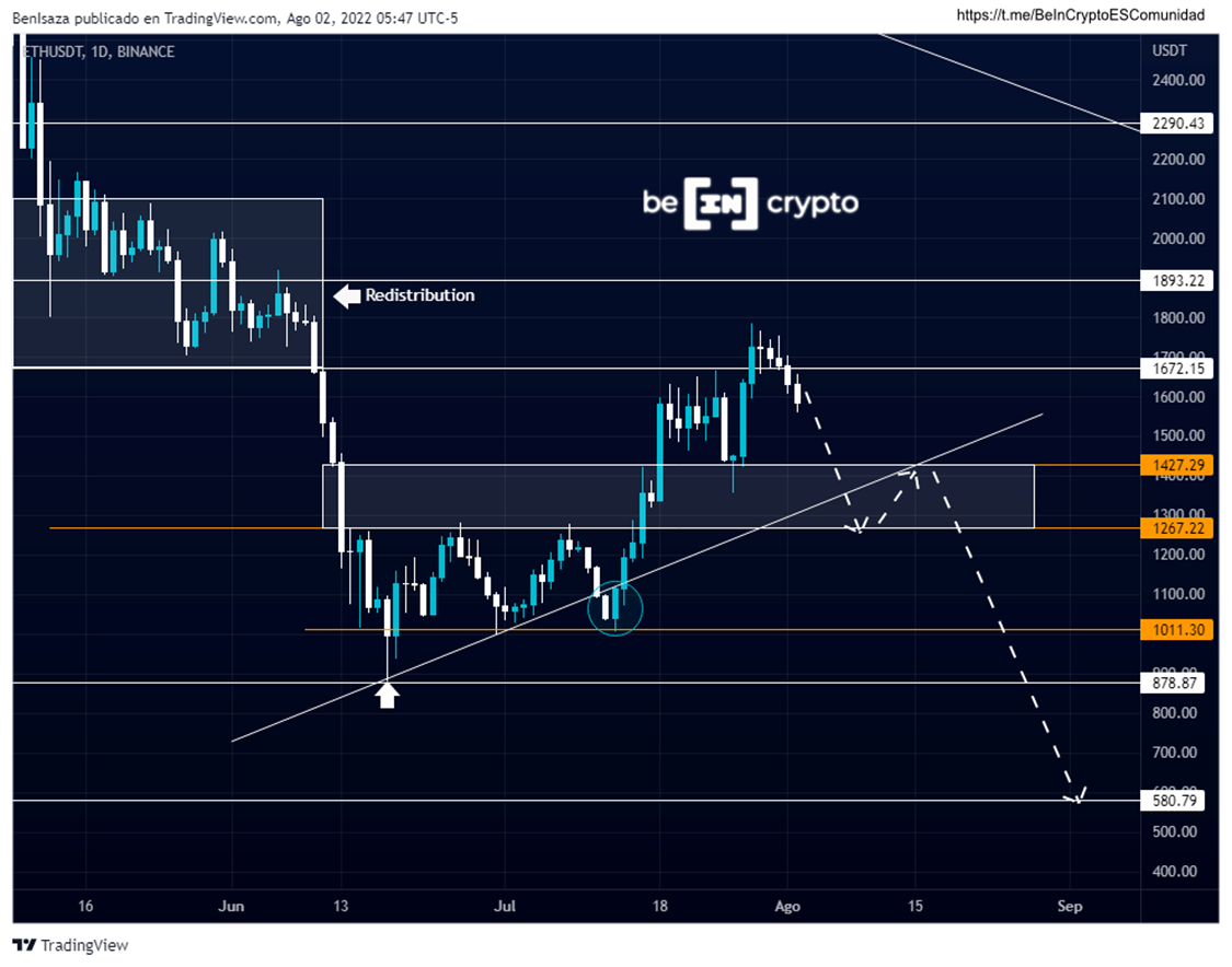 La pérdida de este último soporte anularía la continuidad alcista en Ethereum, la cual propone como objetivo alcanzar la barrera de los 1,000 dólares y 580 dólares respectivamente.