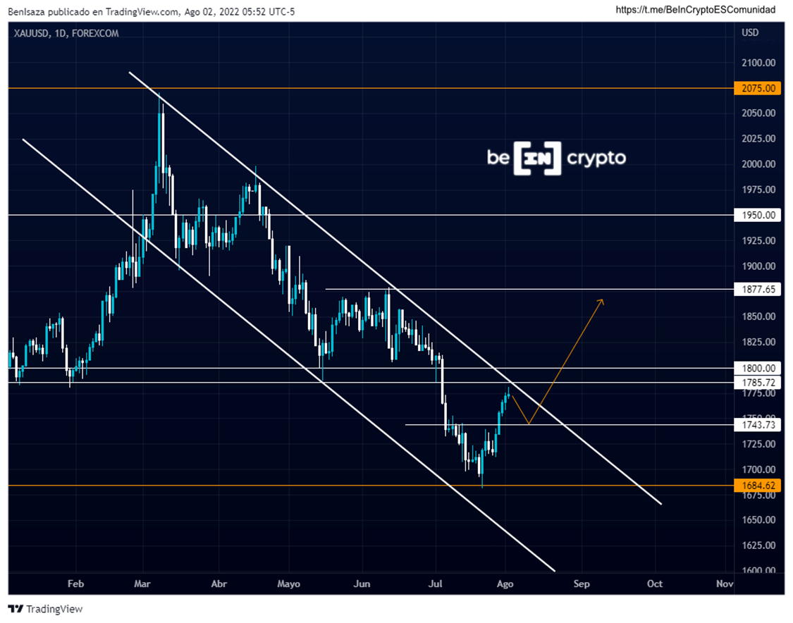 A pesar del último impulso alcista, el precio del oro se encuentra dentro de un canal descendente. La barrera que va desde los 1,785 dólares a los 1,800 dólares es una de las más sólidas con las que cuenta este activo, por lo que puede llegar a presentar un retroceso al nivel de los 1,743 dólares.