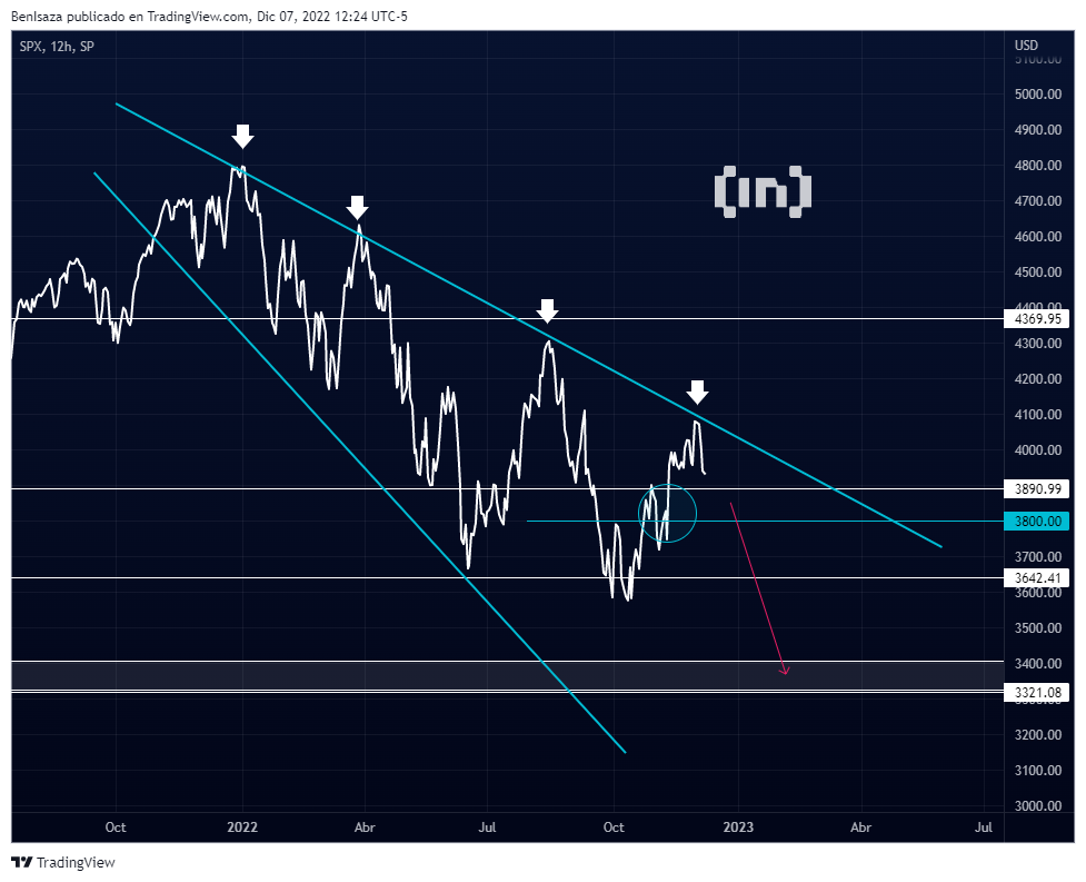 El impulso alcista completo 50 días, y tras rechazar la barrera de los 4,000 puntos, afianza aún más la tendencia bajista con un cuarto toque sobre la directriz superior del triángulo inverso que se aprecia en el gráfico.