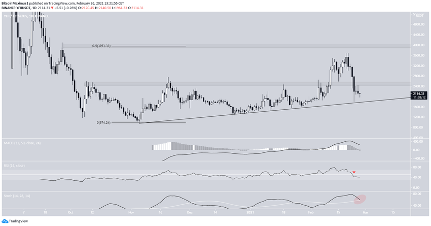 YFII ha estado bajando desde el 19 de febrero, cuando cotizaba en un máximo de 3,682 dólares. Aunque el descenso lo llevó a un mínimo de 1.807 dólares el 23 de febrero, el YFII rebotó en cuanto tocó la línea de soporte ascendente a largo plazo, que se mantiene desde el 1 de noviembre de 2020.
