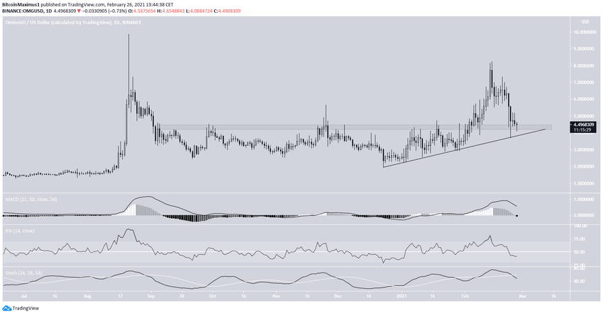 OMG lleva bajando desde el 14 de febrero, cuando alcanzó un máximo de 8,22 dólares. El descenso la ha llevado a un mínimo de 3,69 dólares, donde rebotó en una línea de soporte ascendente.