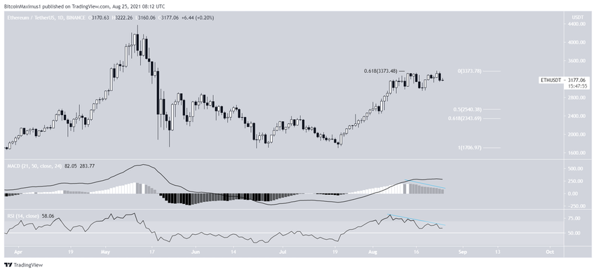 Similar a BTC, ETH se ha estado moviendo hacia arriba desde el 20 de julio. Logró alcanzar un máximo de 3,327 dólares el 13 de agosto antes de caer.