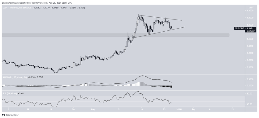 ALGO ha estado aumentando desde que salió de una cuña descendente el 6 de agosto. El movimiento ascendente continuó hasta que se alcanzó un máximo de 1.24 dólares el 22 de agosto. El máximo se hizo muy cerca del nivel de resistencia de retroceso de Fibonacci de 0,5 en 1.26 dólares.