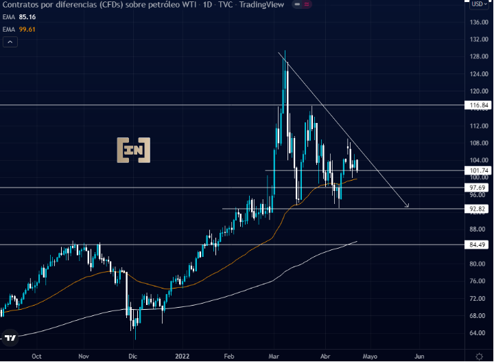 El obstáculo inmediato será la media móvil de 50 periodos lo que respecta al área de soporte de los 97.69 dólares. De ser vulnerada esta área el precio puede descender buscando la media móvil de 200 períodos que de momento se ubica sobre el área de soporte de los 84.49 dólares.