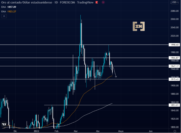Por lo tanto, el oro podría perder la zona de confort de los 1,915 dólares y poner a prueba el área de la media móvil de 200 periodos en los 1,853 dólares.