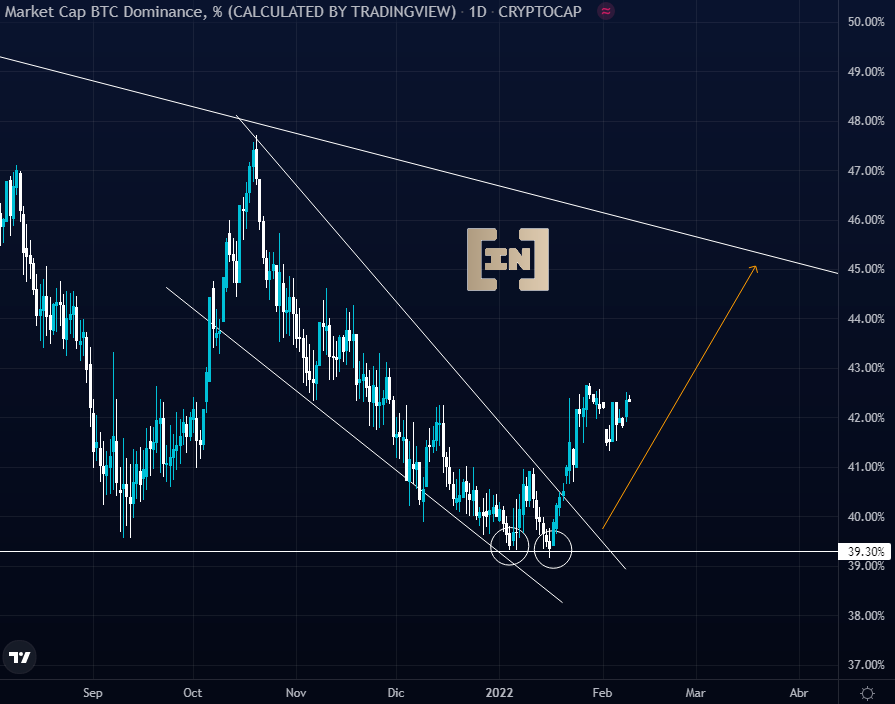 Como se aprecia en el gráfico, el último impulso alcista en el dominio de BTC ha perforado la directriz superior de la cuña descendente y se proyecta a la resistencia dinámica de los 45 puntos.