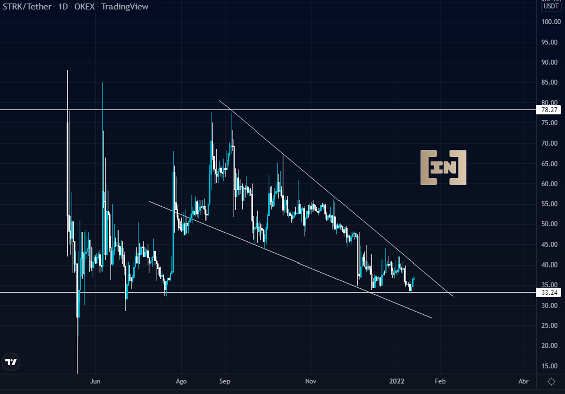 Como se puede apreciar en el gráfico, el precio de STRK se encuentra formando el patrón chartista cuña descendente. Los máximos y mínimos decrecientes demuestran agotamiento por la fuerza vendedora y por otra parte una estabilidad en la cotización sobre el soporte de los 33 dólares.
