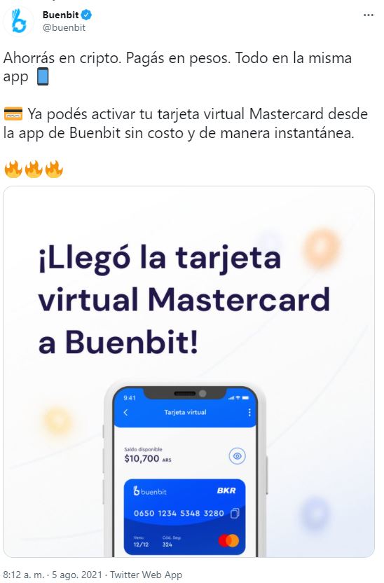 A través de su cuenta de Twitter, Buenbit explica que los usuarios podrán vender o convertir sus criptomonedas a pesos argentinos y viceversa con su tarjeta Mastercard prepagada y si sobra saldo por alguna compra se puede reconvertir a criptomonedas.