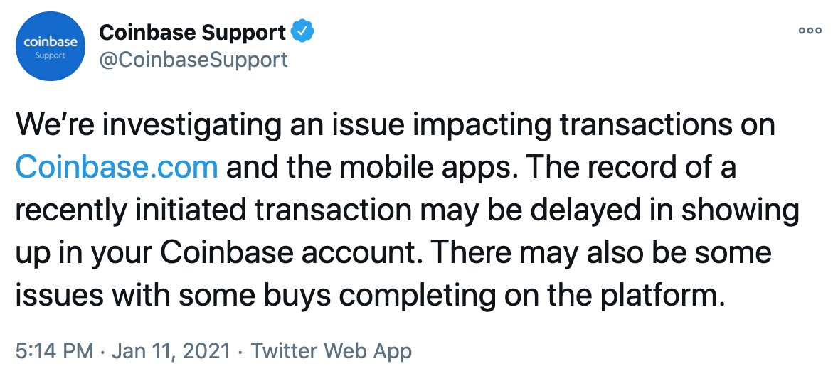 SponsoredEstamos investigando un asunto que afecta a las transacciones en Coinbase.com y a las aplicaciones móviles. El registro de una transacción iniciada recientemente puede tardar un tiempo en aparecer en su cuenta Coinbase. También puede haber algunos problemas con algunas compras completadas en la plataforma.