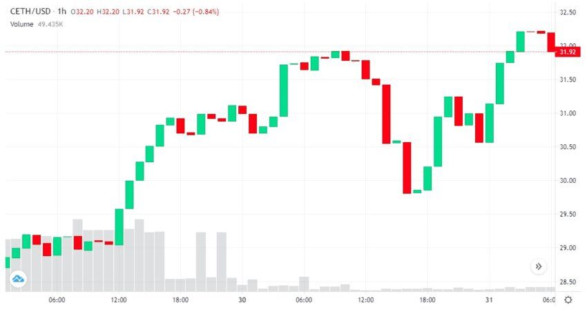 A pesar del incidente, el token cETH no parece haberse visto afectado en términos de precio. cETH en realidad ha aumentado ligeramente en las últimas 24 horas, un 1.7% hasta 32,26 dólares.