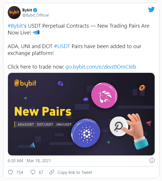 Bybit, uno de los exchanges más grandes del mercado cripto, anunció que está lanzando contratos perpetuos para tres de las criptomonedas más grandes del espacio. Estas incluyen Cardano (ADA), Uniswap (UNI) y Polkadot (DOT), las cuales se encuentran entre las 10 principales criptomonedas por capitalización de mercado.