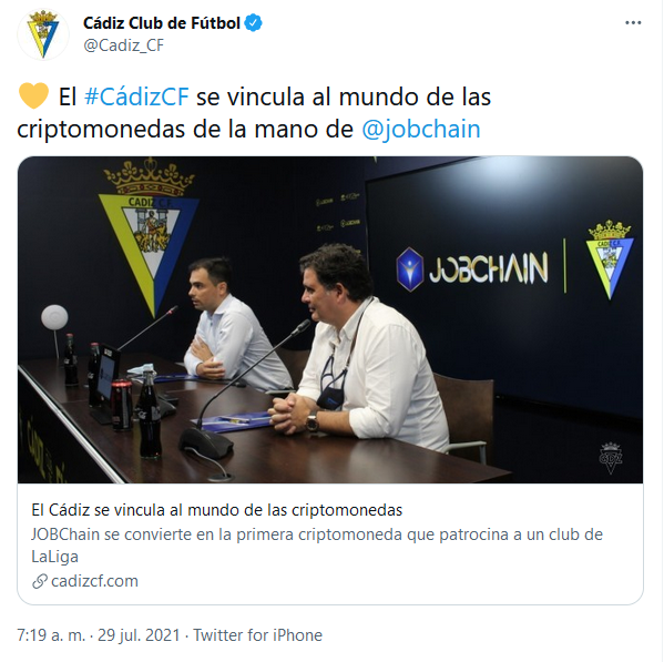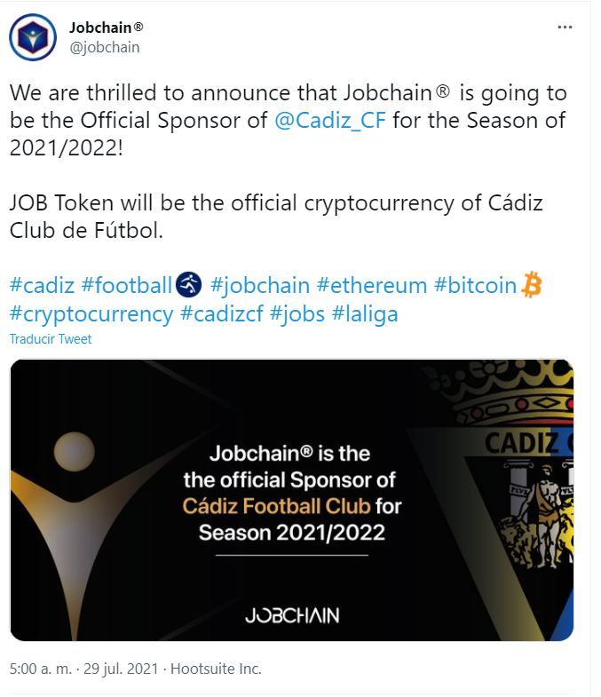 El equipo de fútbol de La Liga de España, El Cádiz C.F., anunció que JOBChain es su nuevo patrocinador oficial, lo que lo convierte en el primer club de esa liga en vincularse con un exchange de criptomonedas para la próxima temporada.