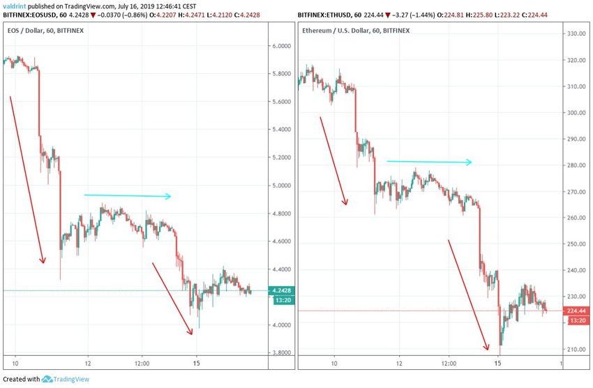 Ethereum y EOS han seguido un patrón ligeramente diferente a lo largo de sus movimientos descendentes.