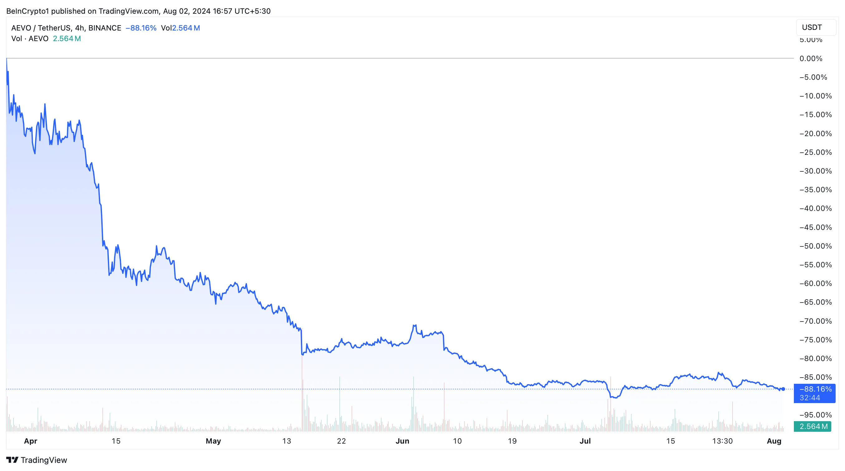 Específicamente, señala la drástica caída del token Aevo, que bajó de un máximo de casi 4 dólares en marzo de 2024 a un valor actual de 0.434 dólares. Esto representa una dramática caída del 90% en valor en solo cinco meses.
