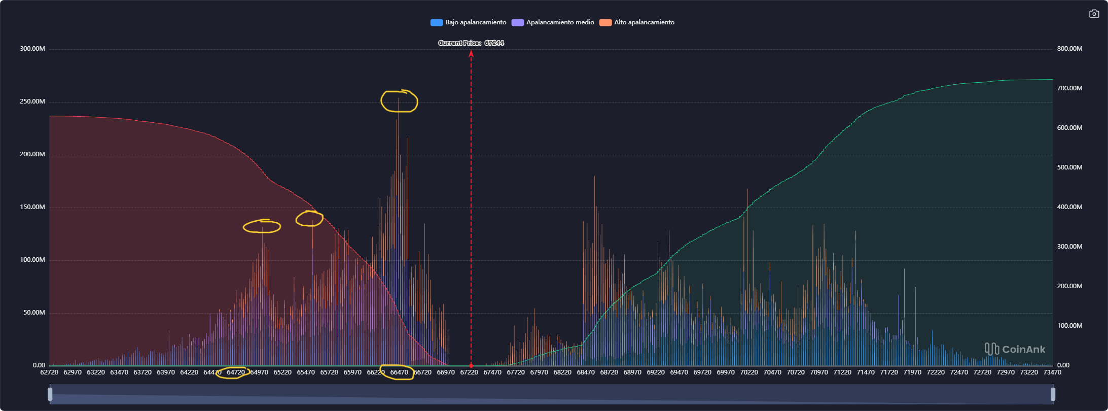 “Viendo el mapa de liquidaciones de Bitcoin digo que necesitamos una bajada mas para limpiar a los ansiosos. – En 66.470 tenemos una gran vela de apalancamiento y así sucesivamente hasta 64.720- Por las dudas seria mejor bajar a 60k de nuevo y borrar todo el mapa long”, destacó Battaglia en X (antes Twitter)