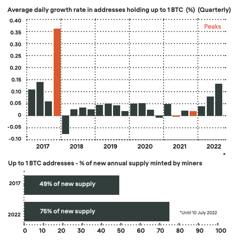 Cabe mencionar que según estos datos, la principal fuente de adquisición de Bitcoin por parte de los camarones son los mineros de BTC. En 2017, el 49% de la oferta proporcionada por los mineros fue acumulada por entidades hasta 1 BTC. En 2022, es hasta el 75%.