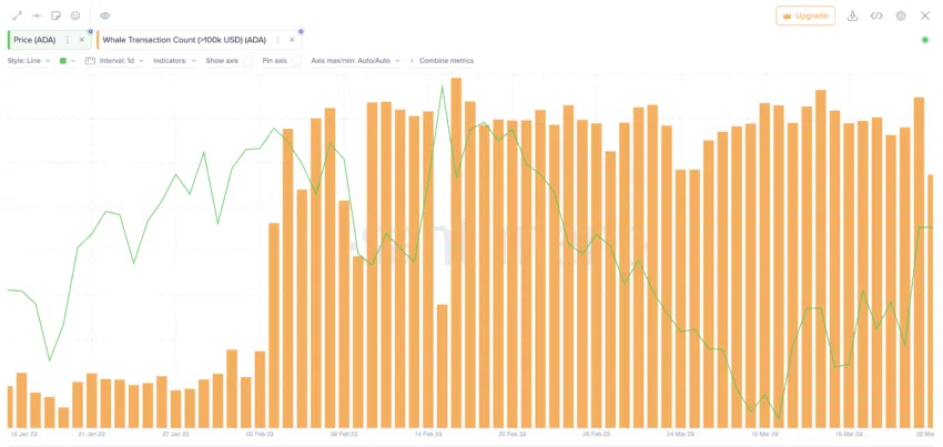 Los datos en cadena de Santiment muestran que la actividad de las ballenas en la red de Cardano ha aumentado desde el reciente lanzamiento de la stablecoin Djed. Las 2117 transacciones de ballenas registradas el 21 de marzo son considerablemente más altas que las 327 transacciones informadas el 1 de febrero.