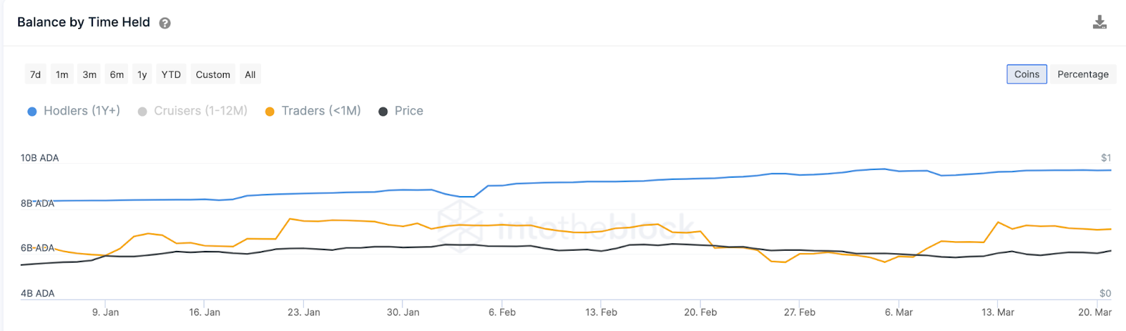 Entre el 3 de febrero y el 22 de marzo, el saldo en los monederos de los holders a largo plazo aumentó de 8,500 millones de ADA a 9,700 millones de ADA. Durante el mismo período, las monedas en poder de los traders a corto plazo se redujeron en casi 200 millones de ADA.