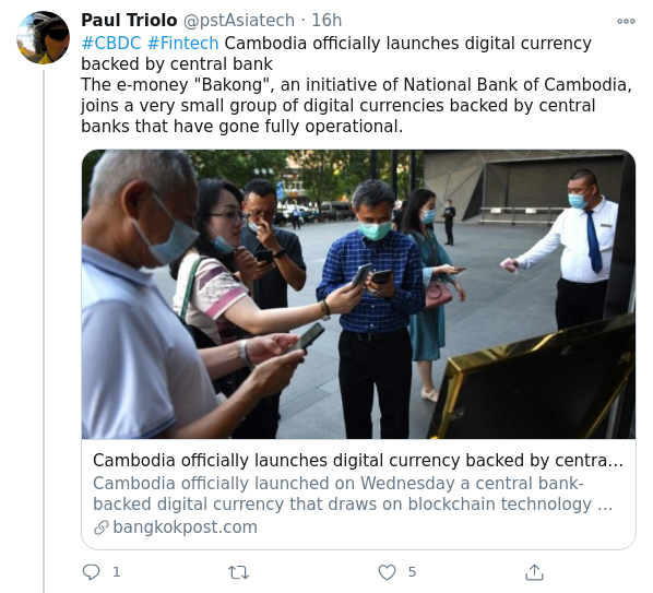 En medio de todo esto, Camboya se ha convertido en el segundo país del mundo después de las Bahamas en lanzar un programa CBDC en pleno funcionamiento después de casi un año de pruebas a partir de julio de 2019. Según los informes, veinte instituciones financieras del país participan en Bakong, y se espera que se unan más a medida que el proyecto gane impulso.