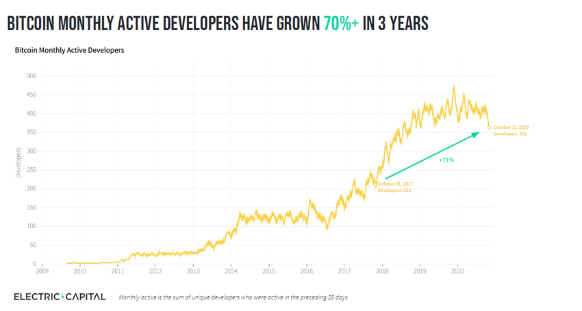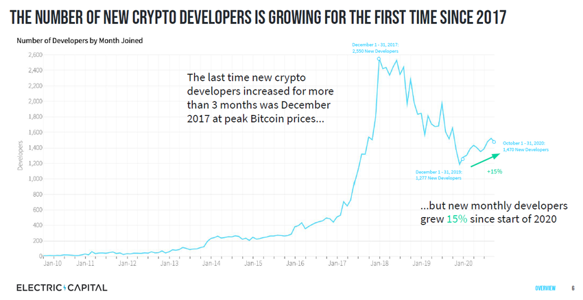 Electric Capital publicó un informe que analiza las tendencias de desarrollo de proyectos en el mercado de las criptomonedas. Según varias métricas, el desarrollo técnico está en su punto más fuerte desde 2017.